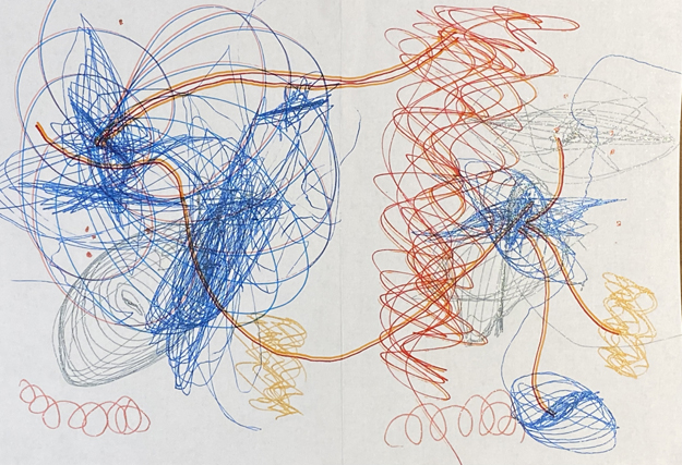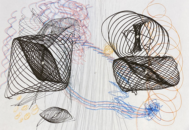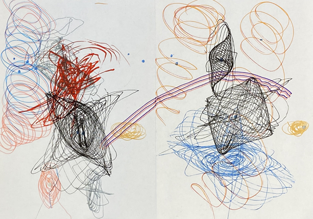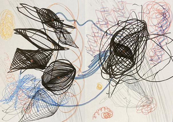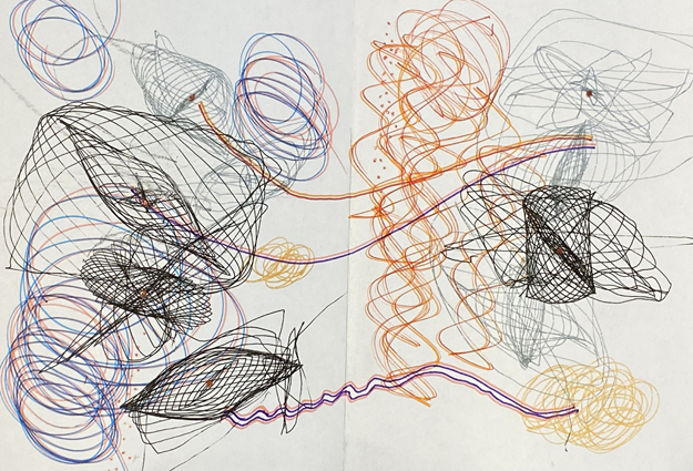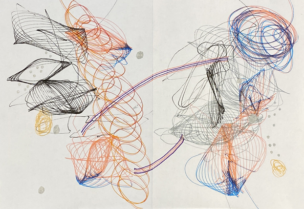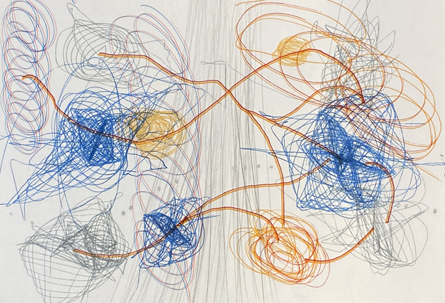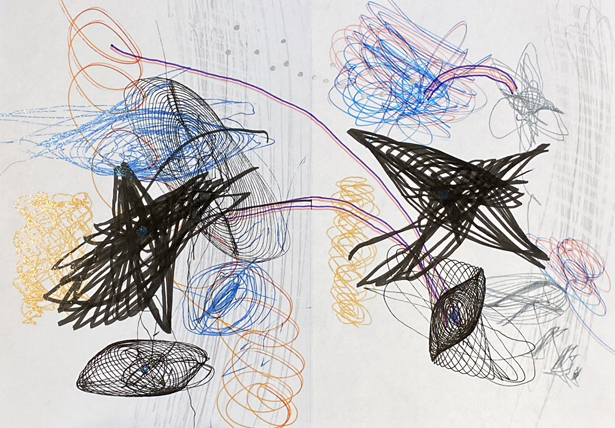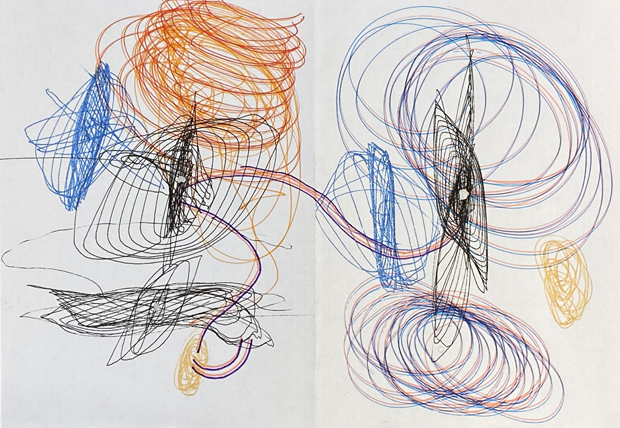 Bridges across Broken Harmonies: in this series of drawings, pendular figures were generated by a simple harmonograph, in relationship to gesture drawing forms inspired by waves, oscillations, and feedback cycles in nature. Made as diptychs, disparate pages were joined together to create bridges across diverse worlds — forms become communications with each other. The resulting diptychs are about 6″ x 8″, on paper, in paint, glitter, normal and reflective inks, and graphite.